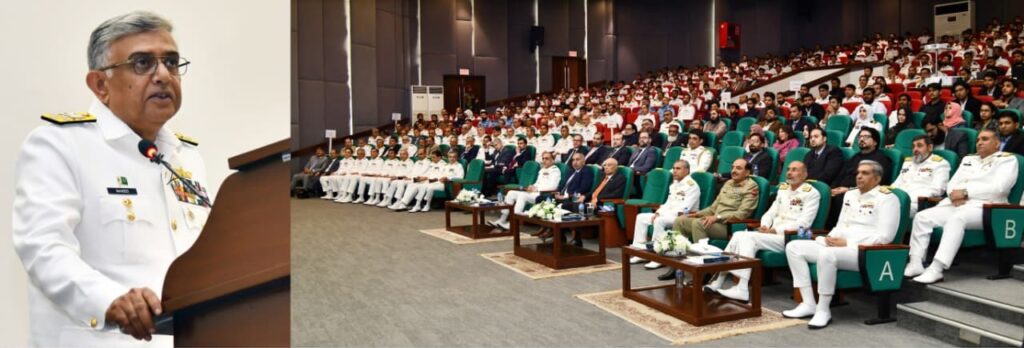 Chief of the Naval Staff Admiral Naveed Ashraf addressing the audience during Maritime Centre of Excellence Conference on Emerging Technologies and the Future Warfare