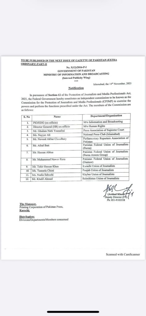 According to the notification, the commission will comprise 12 members. The Principal Information Officer of the Ministry of Information will serve as an ex-officio member, while the Director General of the Ministry of Human Rights has also been nominated.