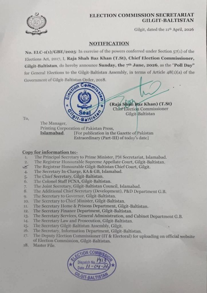 ISLAMABAD: The Election Commission of Gilgit-Baltistan has announced that general elections in Gilgit-Baltistan will be held on June 7, setting the stage for a fresh political contest in the mountainous region.