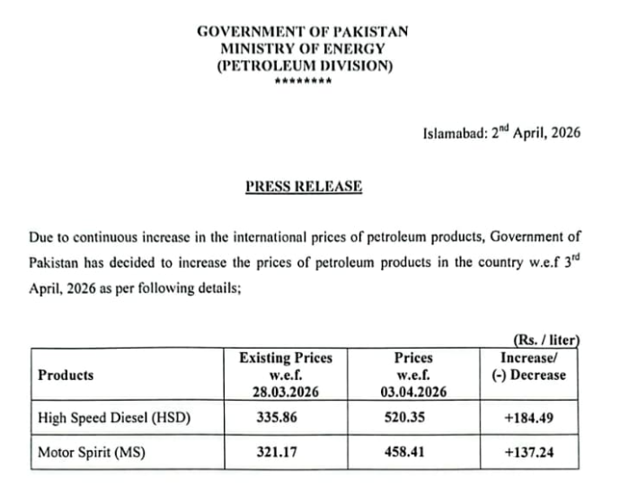 ISLAMABAD: The federal government has announced a sharp increase in petroleum prices, pushing petrol to Rs458 per litre and high-speed diesel to Rs520 per litre, amid rising global crude oil prices linked to tensions in the Middle East.