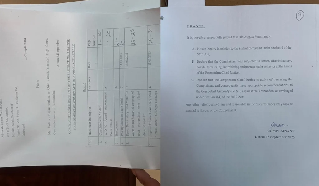 The complaint, submitted to the IHC’s workplace harassment committee headed by Justice Saman Rafat Imtiaz through a court associate, seeks an inquiry under the Protection Against Harassment of Women Act. Mazari alleges that she was subjected to “hostile, discriminatory, threatening, intimidating and unreasonable behaviour” by the chief justice.