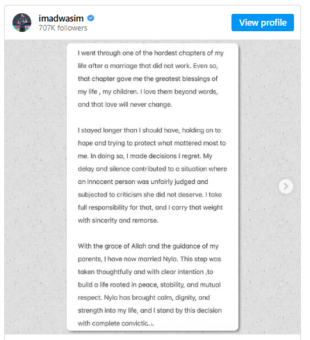 In a statement shared on Instagram, Imad said the decision was taken “thoughtfully and with clear intention” to build a life rooted in peace, stability and mutual respect.