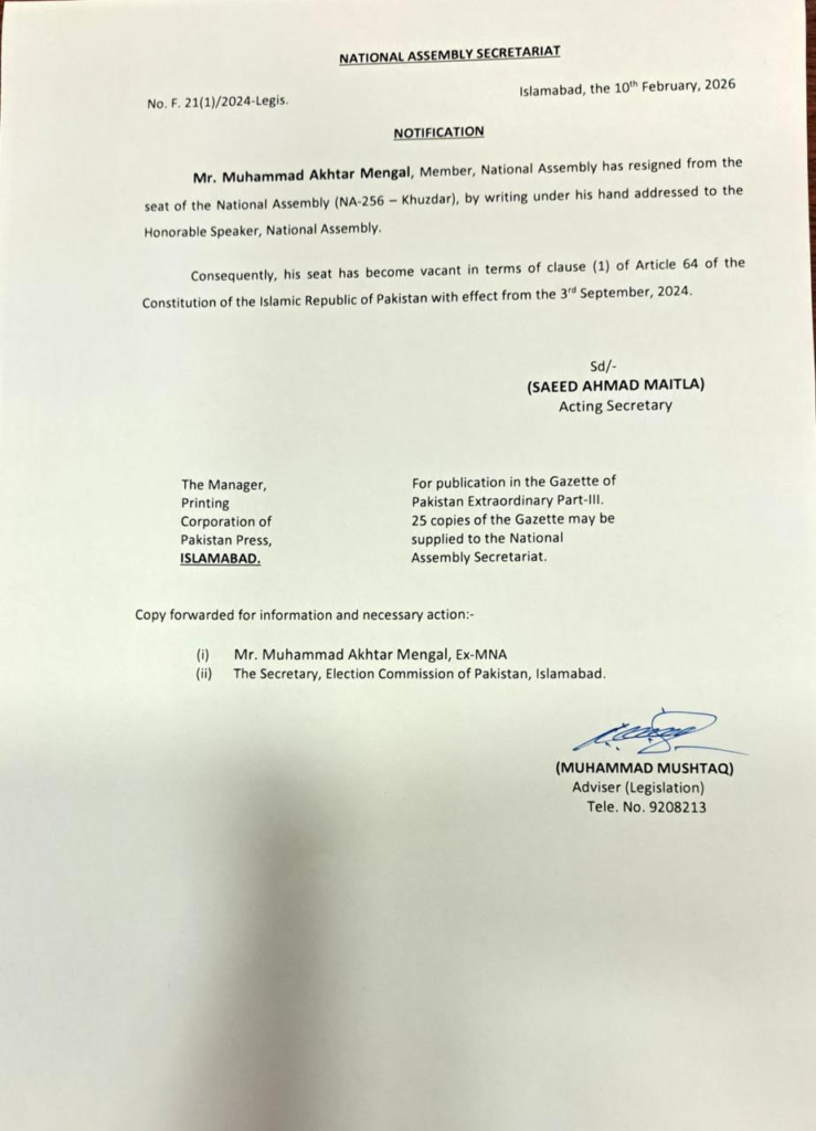 Akhtar Mengal, who was elected from Khuzdar’s NA-256 constituency in the February 2024 general elections, had tendered his resignation on September 3, 2024. He cited the worsening law and order situation in Balochistan and declared that he had lost confidence in the state.