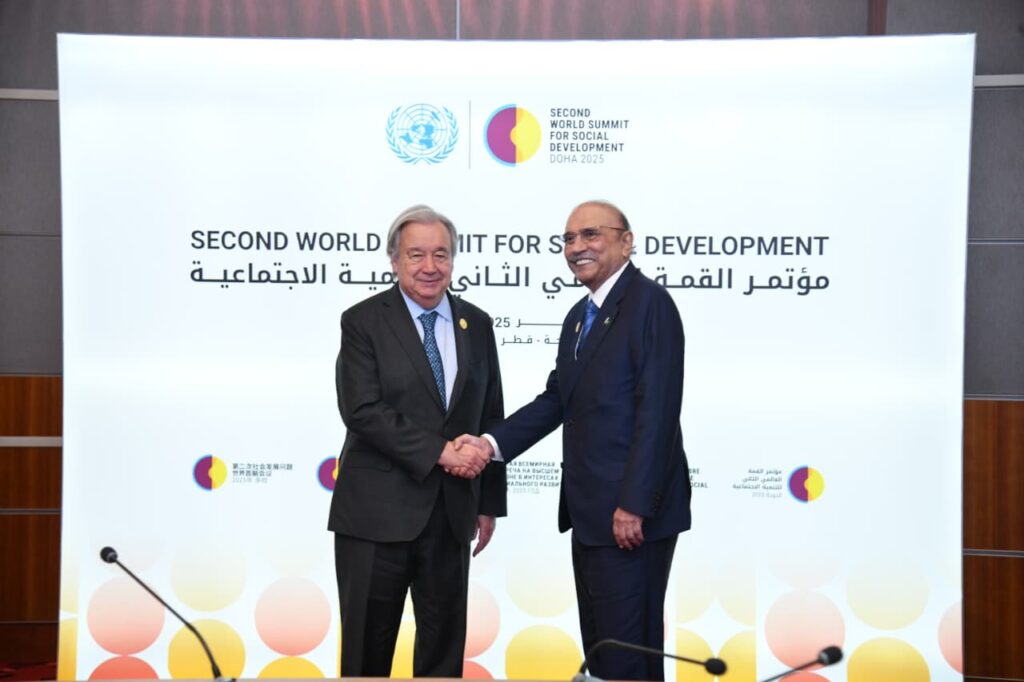 Doha: President Asif Ali Zardari shaking hands with United Nations Secretary-General António Guterres on the sidelines of the Second World Summit for Social Development in Doha.
